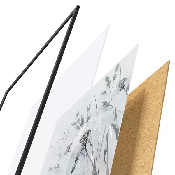 El póster consta de marco, plexiglás, imagen impresa y soporte de aglomerado. El póster puede colgarse inmediatamente en la pared gracias a los soportes de la parte posterior.