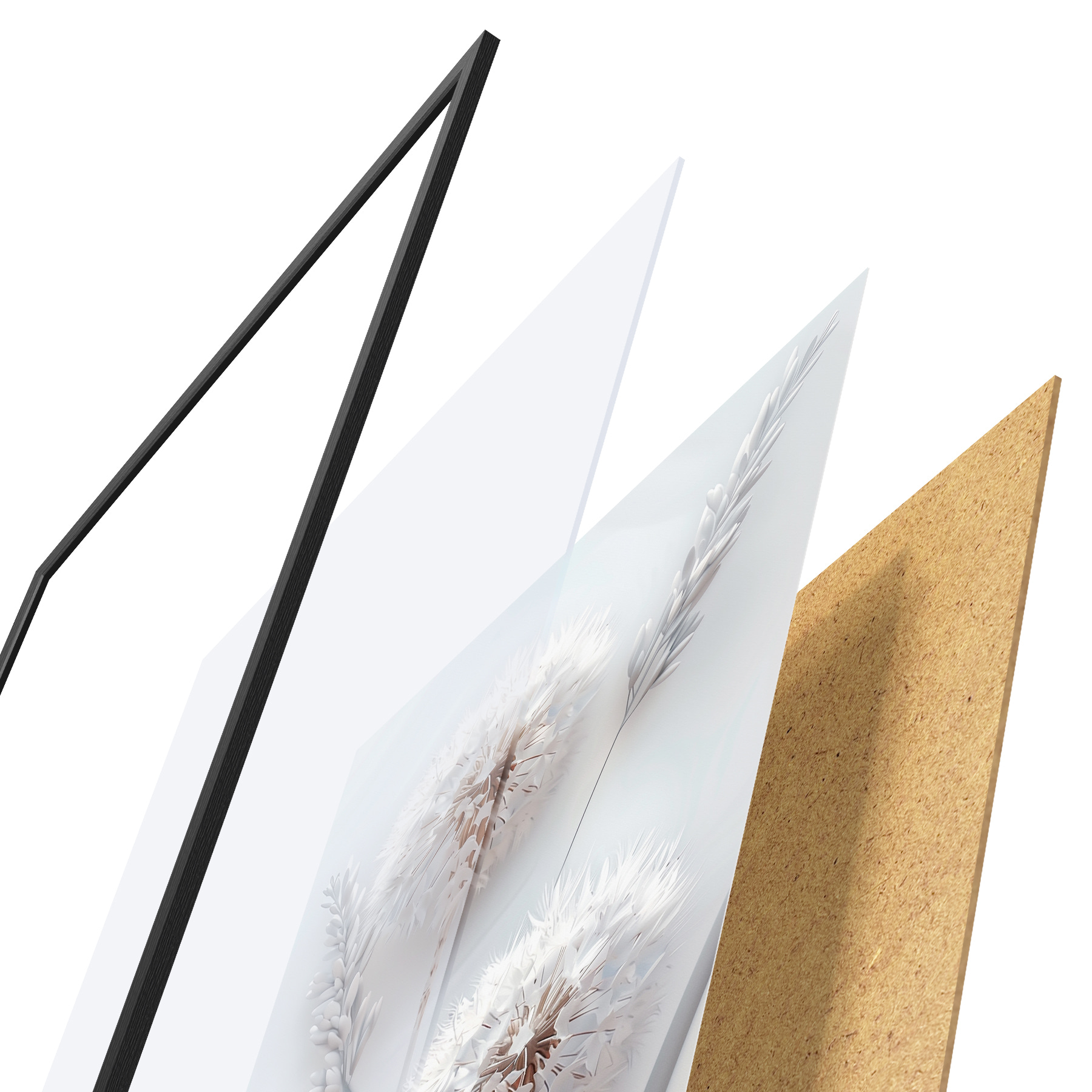 El póster consta de marco, plexiglás, imagen impresa y soporte de aglomerado. El póster puede colgarse inmediatamente en la pared gracias a los soportes de la parte posterior.