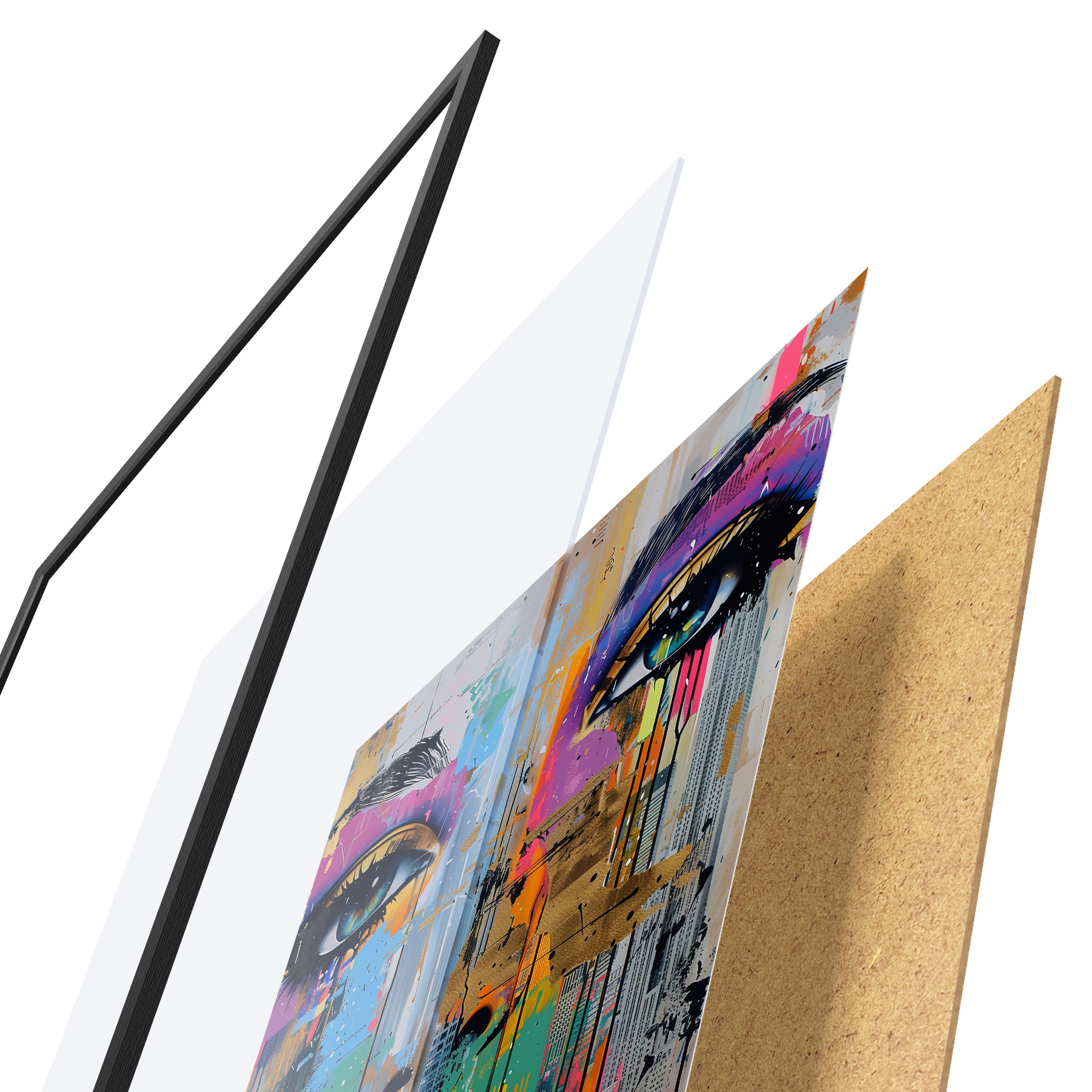 El póster consta de marco, plexiglás, imagen impresa y soporte de aglomerado. El póster puede colgarse inmediatamente en la pared gracias a los soportes de la parte posterior.