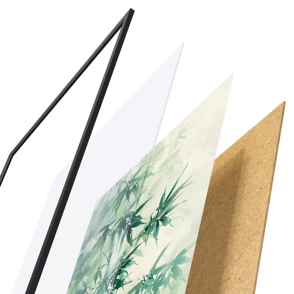 El póster consta de marco, plexiglás, imagen impresa y soporte de aglomerado. El póster puede colgarse inmediatamente en la pared gracias a los soportes de la parte posterior.