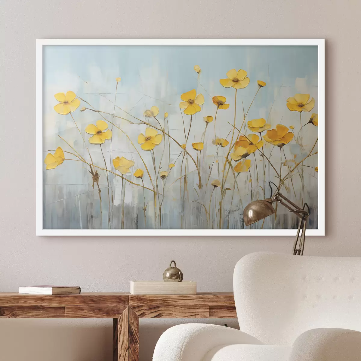 Poster Pequeñas flores amarillas en un cuadro al óleo de tallo largo. f39823