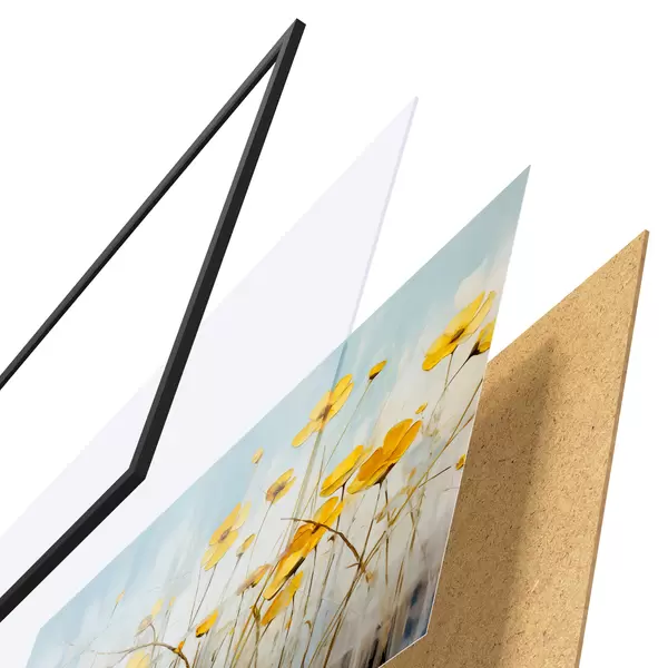 El póster consta de marco, plexiglás, imagen impresa y soporte de aglomerado. El póster puede colgarse inmediatamente en la pared gracias a los soportes de la parte posterior.