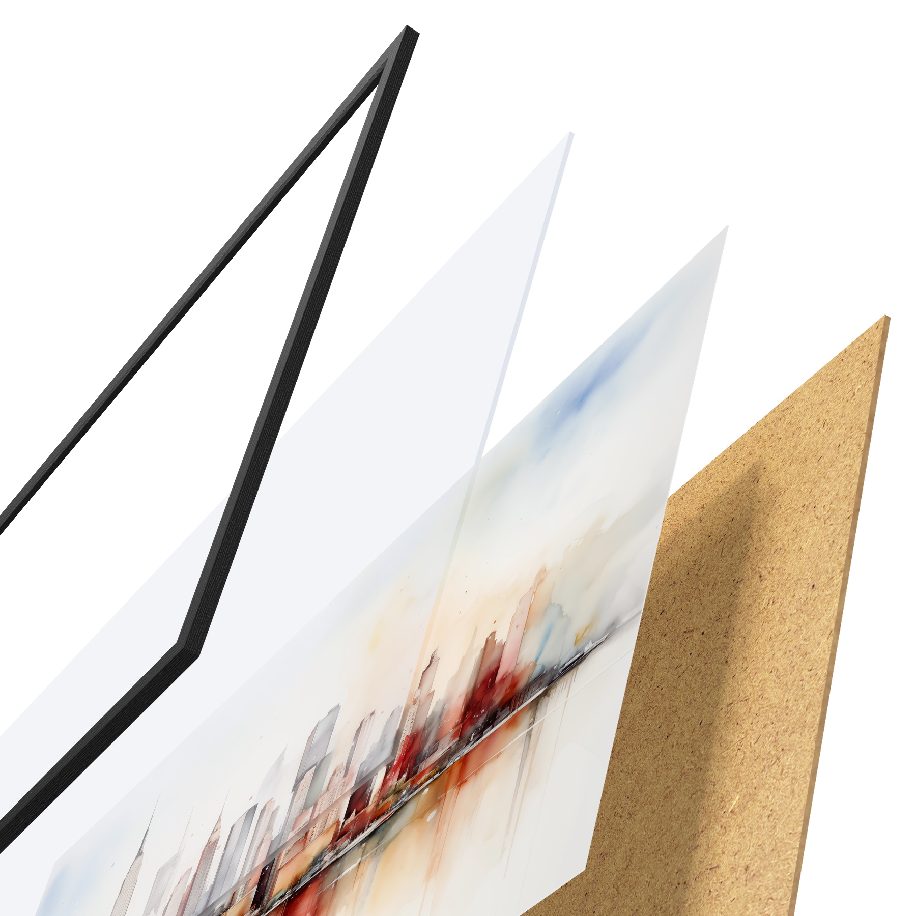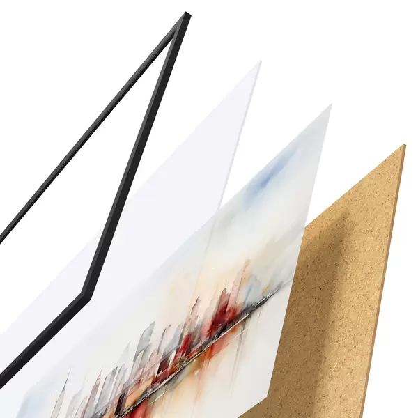 El póster consta de marco, plexiglás, imagen impresa y soporte de aglomerado. El póster puede colgarse inmediatamente en la pared gracias a los soportes de la parte posterior.