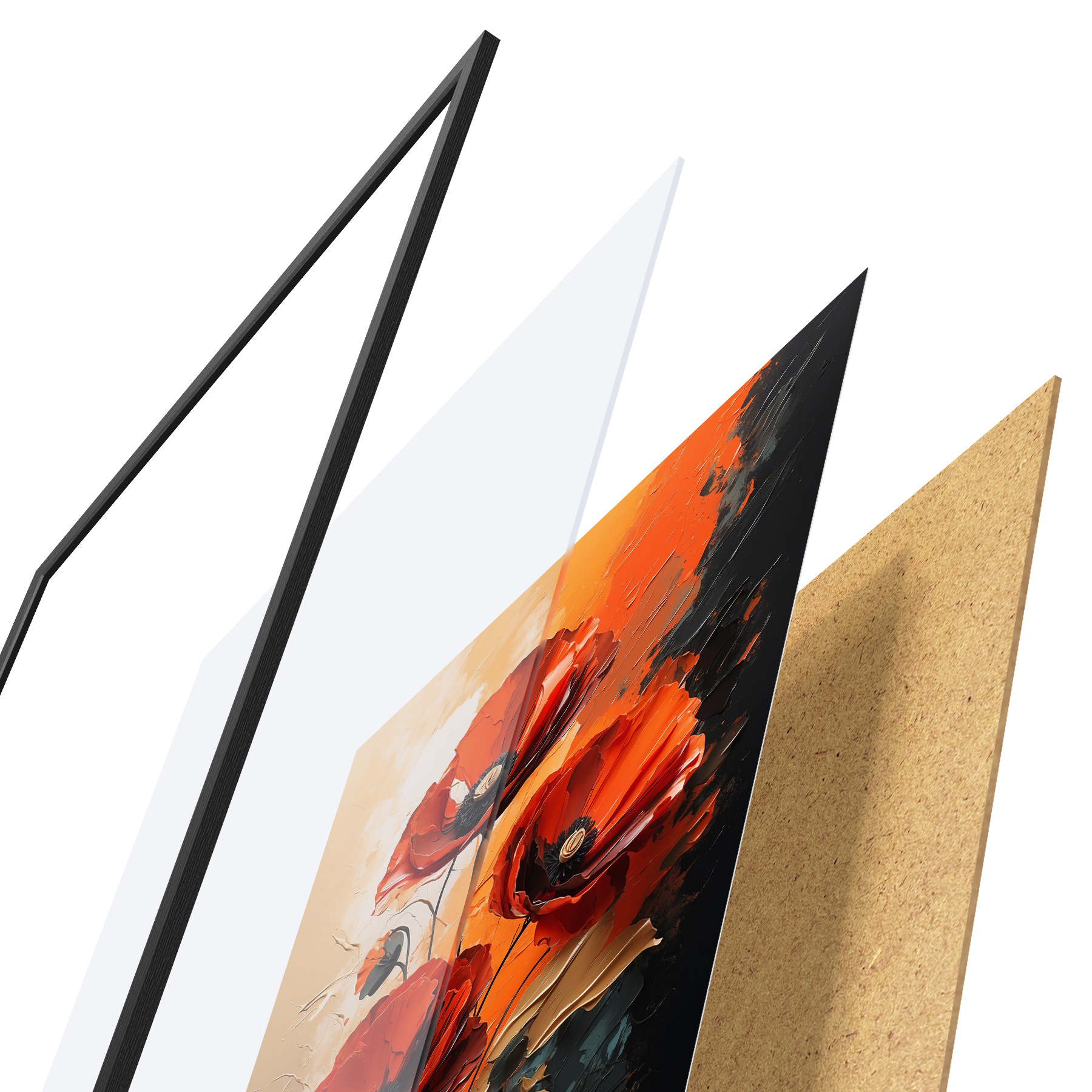 El póster consta de marco, plexiglás, imagen impresa y soporte de aglomerado. El póster puede colgarse inmediatamente en la pared gracias a los soportes de la parte posterior.