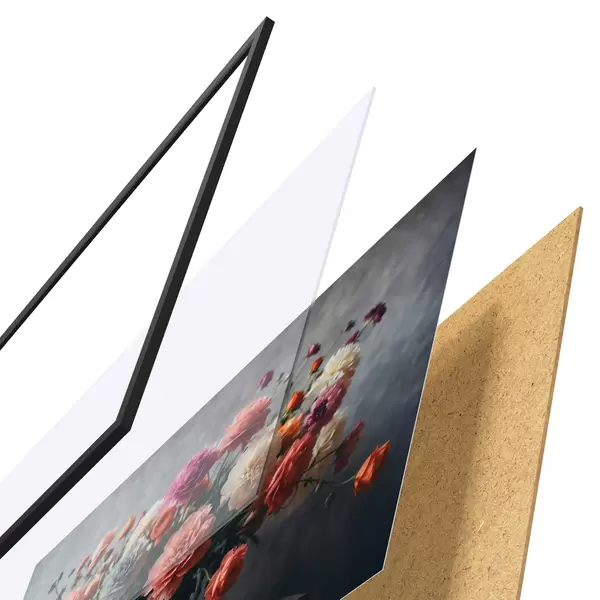 El póster consta de marco, plexiglás, imagen impresa y soporte de aglomerado. El póster puede colgarse inmediatamente en la pared gracias a los soportes de la parte posterior.