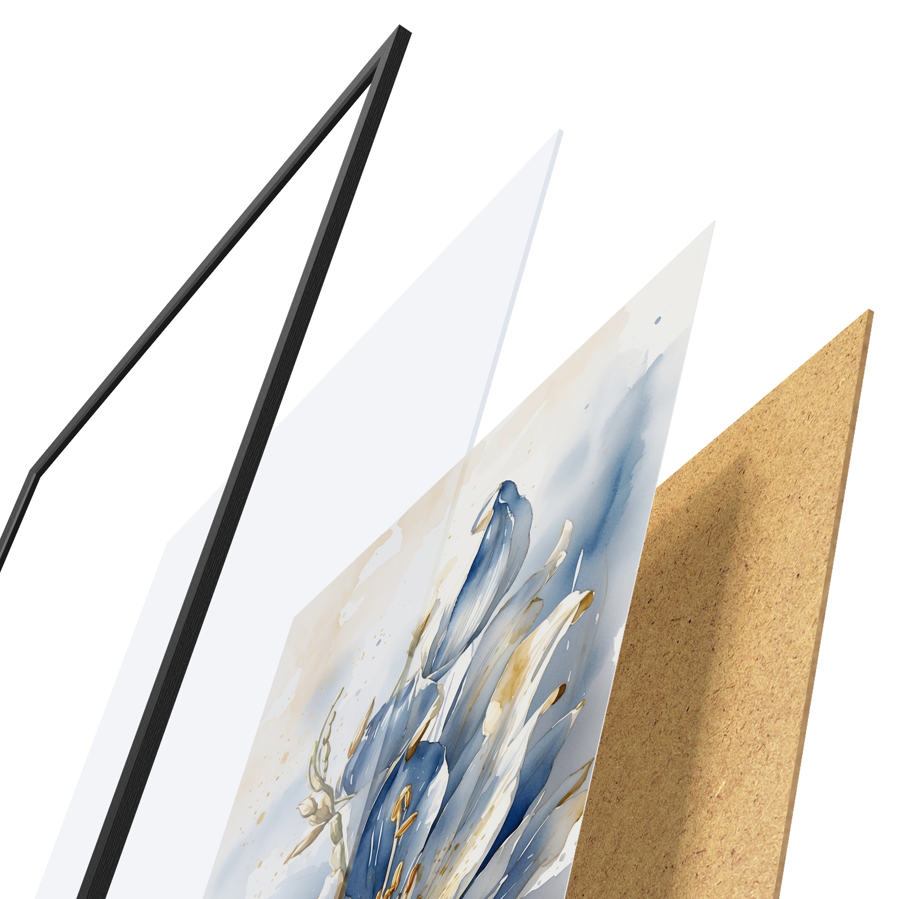 El póster consta de marco, plexiglás, imagen impresa y soporte de aglomerado. El póster puede colgarse inmediatamente en la pared gracias a los soportes de la parte posterior.