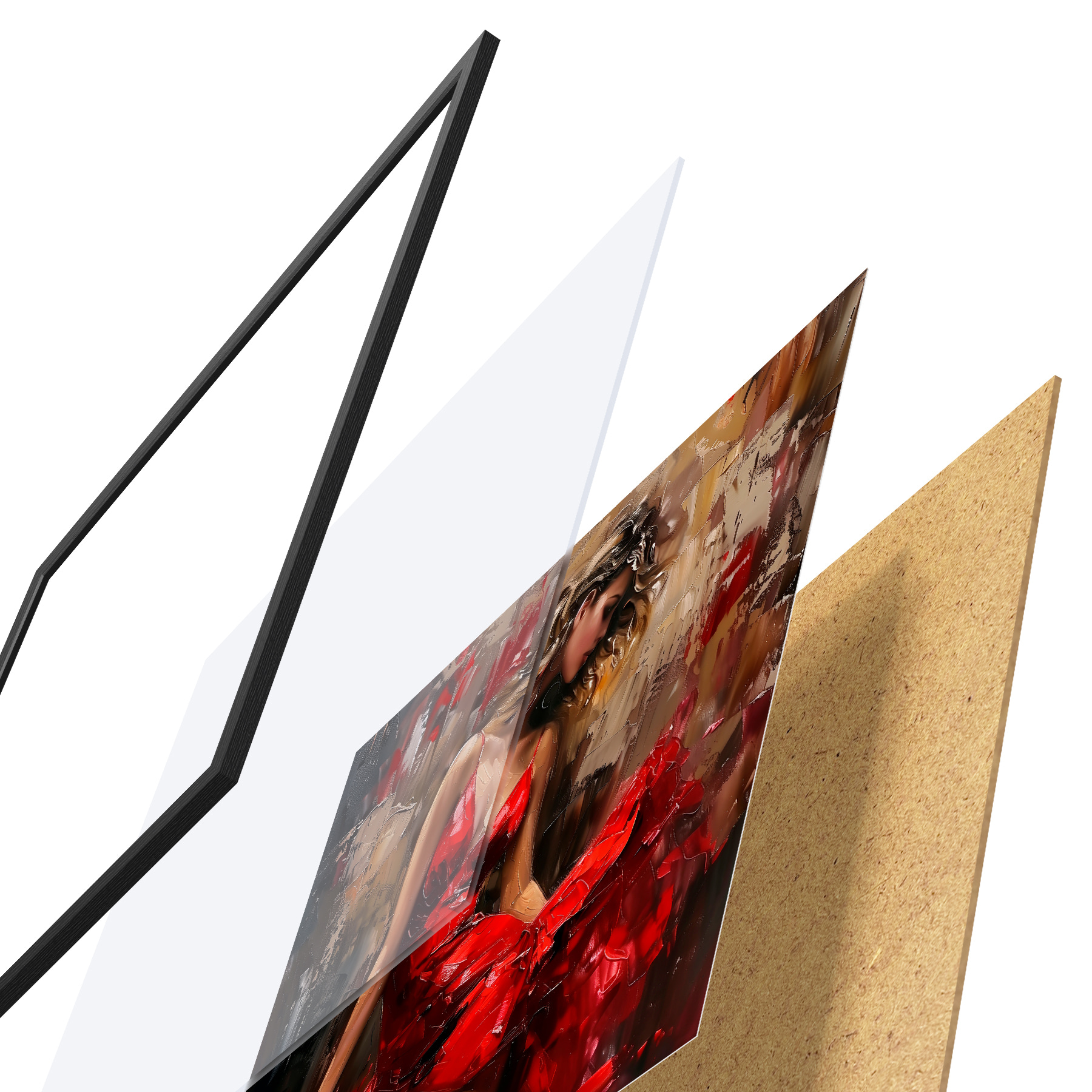 El póster consta de marco, plexiglás, imagen impresa y soporte de aglomerado. El póster puede colgarse inmediatamente en la pared gracias a los soportes de la parte posterior.