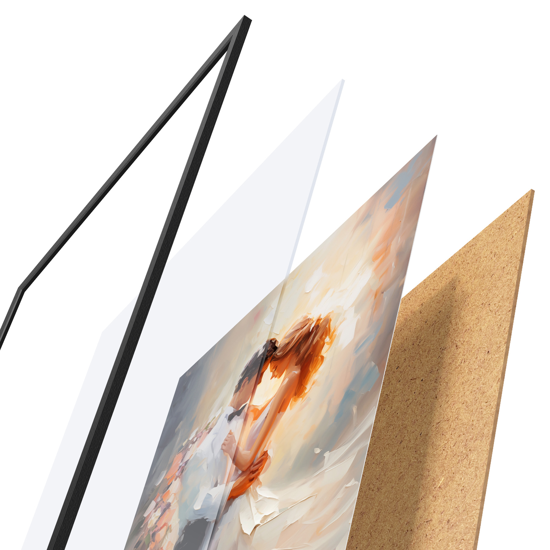 El póster consta de marco, plexiglás, imagen impresa y soporte de aglomerado. El póster puede colgarse inmediatamente en la pared gracias a los soportes de la parte posterior.