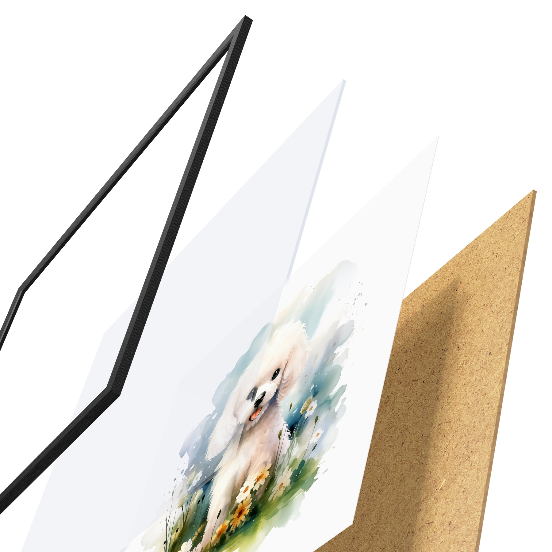 Poster Pequeño caniche blanco sentado en una acuarela de flores Nr f39928