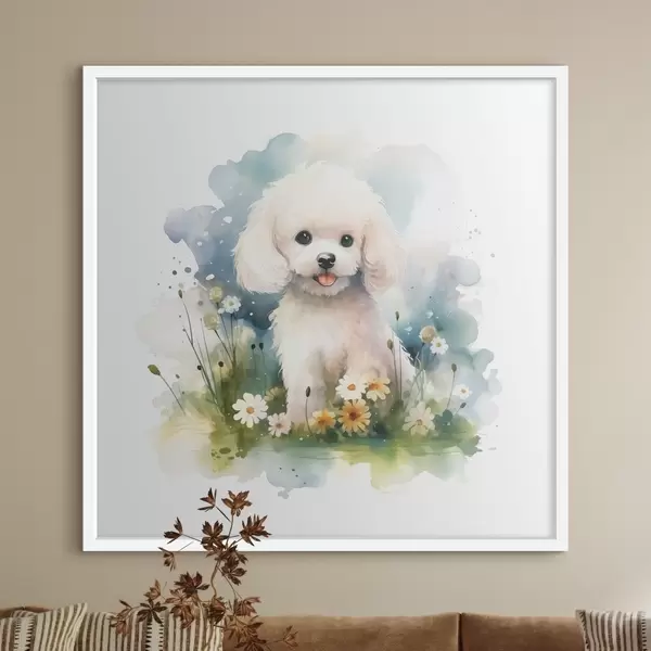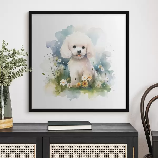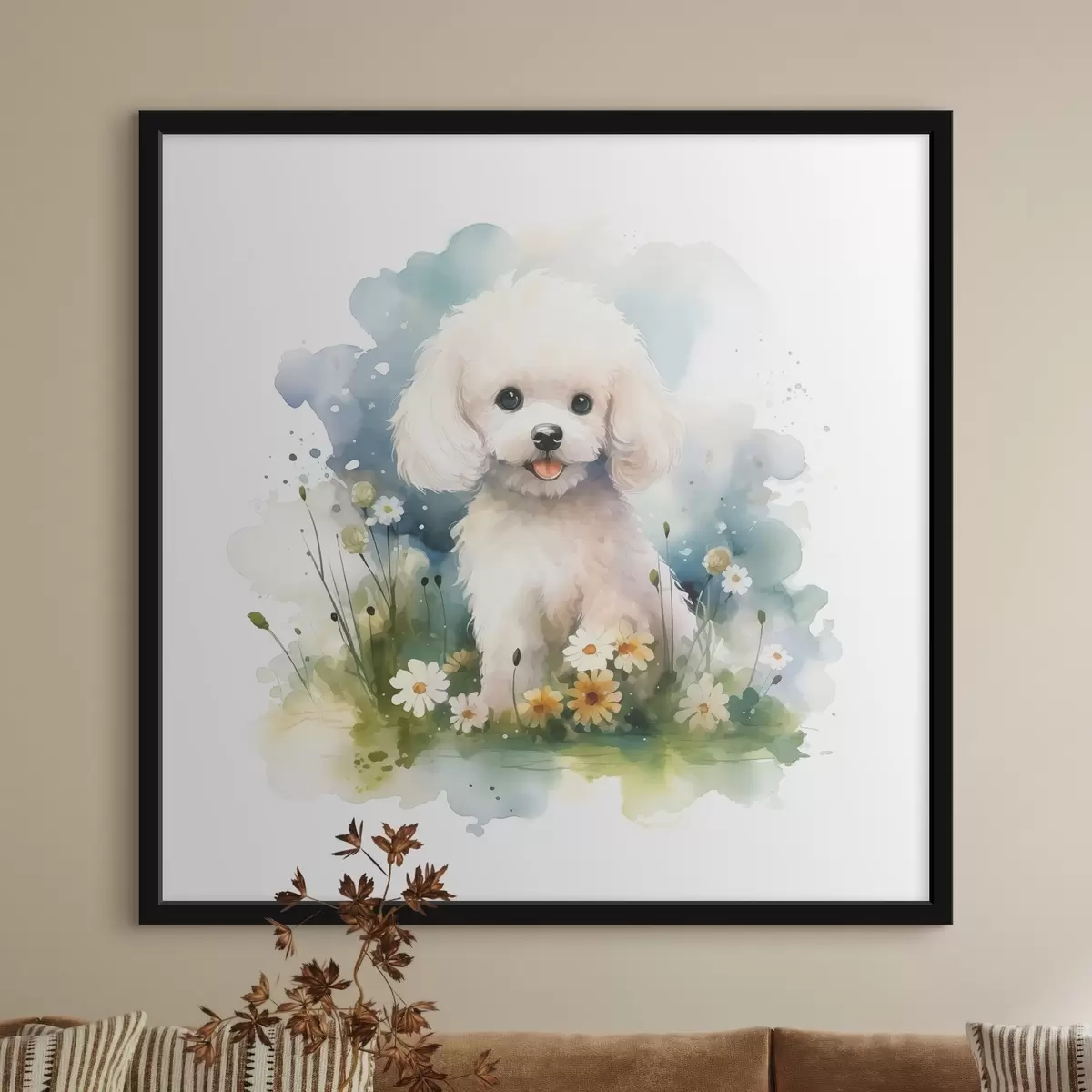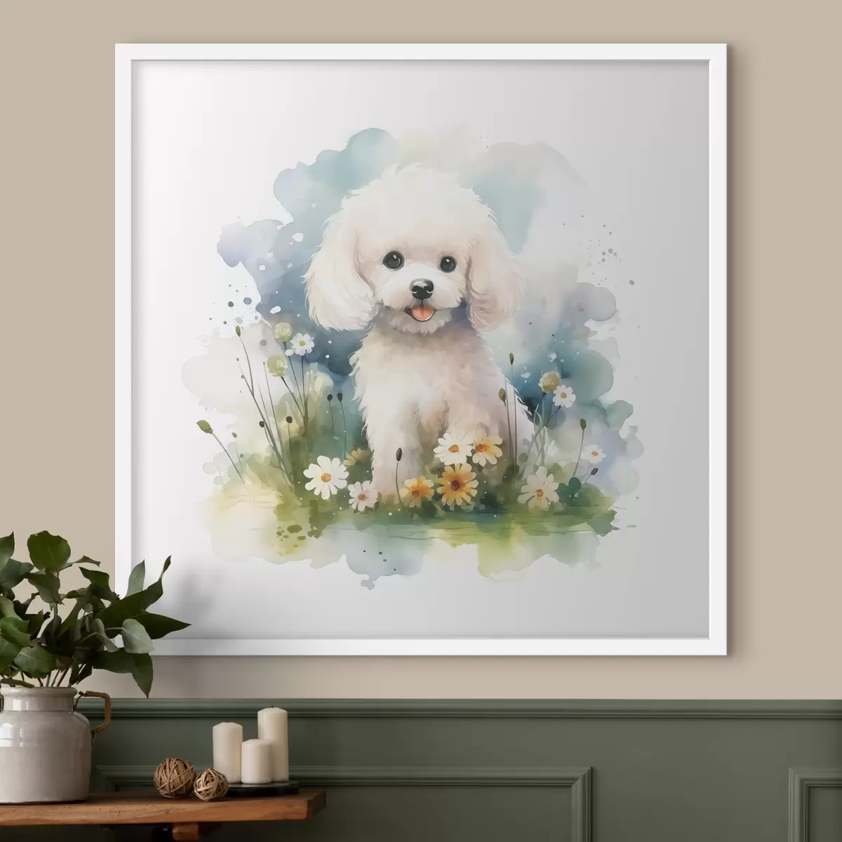 Poster Pequeño caniche blanco sentado en una acuarela de flores Nr f39928