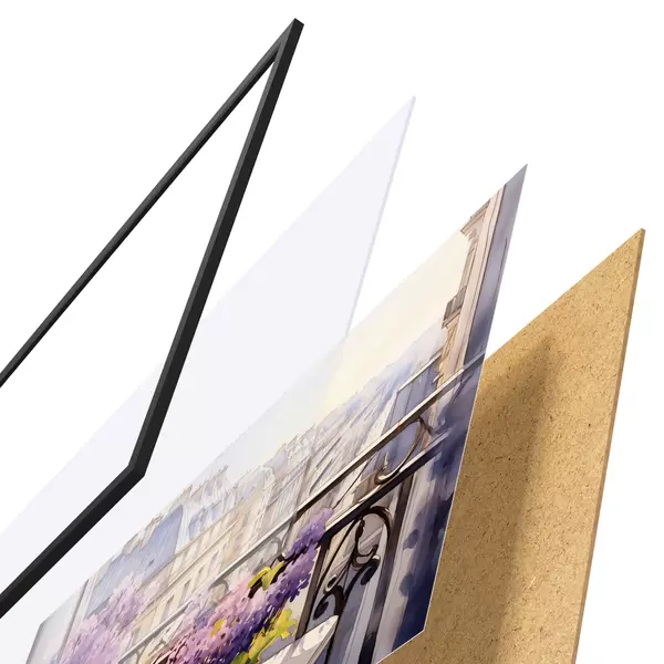 El póster consta de marco, plexiglás, imagen impresa y soporte de aglomerado. El póster puede colgarse inmediatamente en la pared gracias a los soportes de la parte posterior.