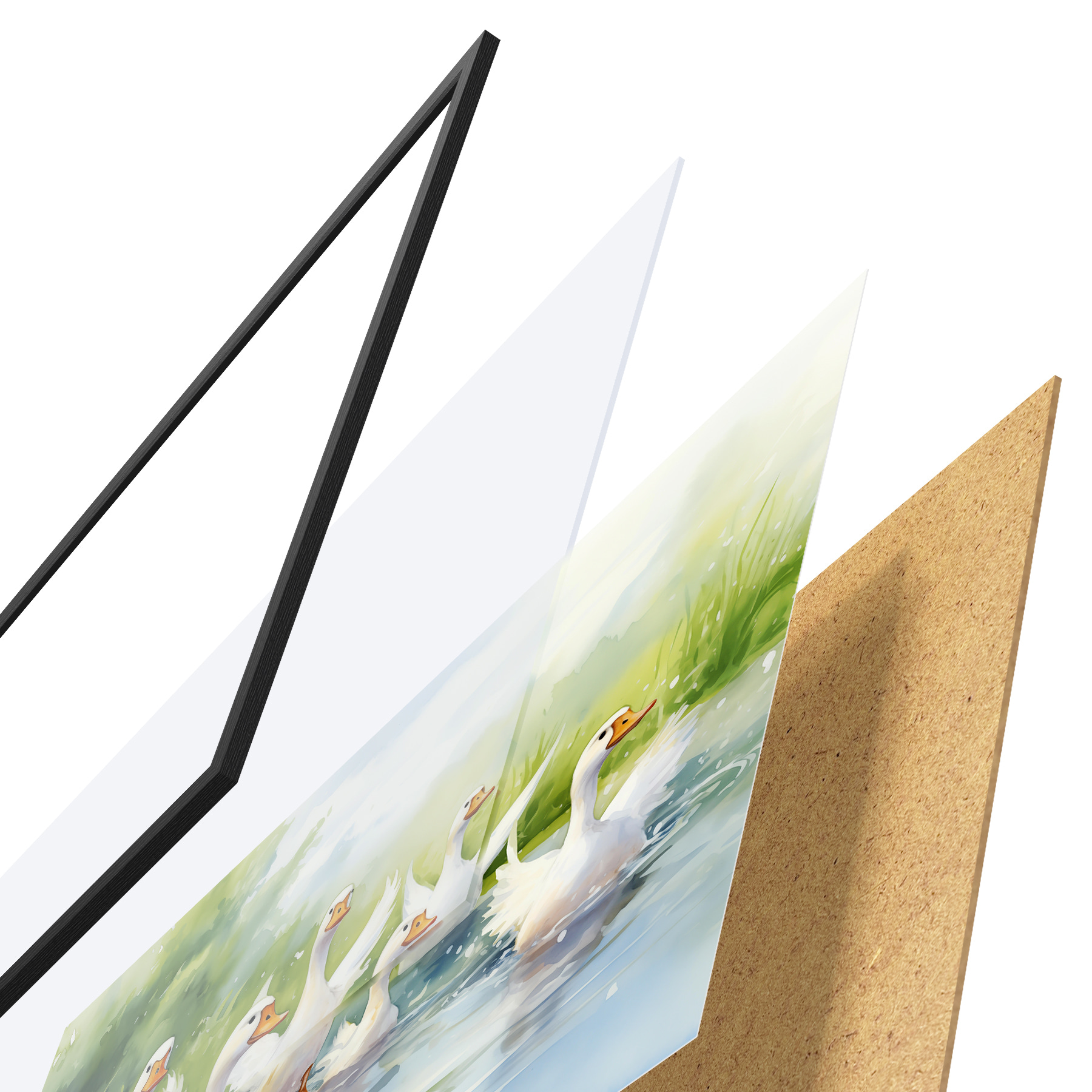El póster consta de marco, plexiglás, imagen impresa y soporte de aglomerado. El póster puede colgarse inmediatamente en la pared gracias a los soportes de la parte posterior.