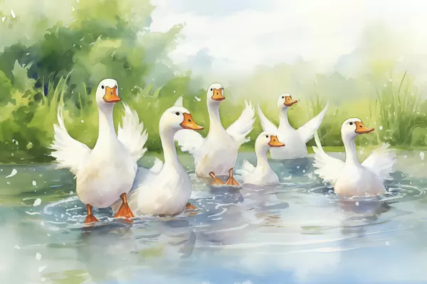 Poster Gansos blancos bañándose en un estanque, pintura de acuarela f39939