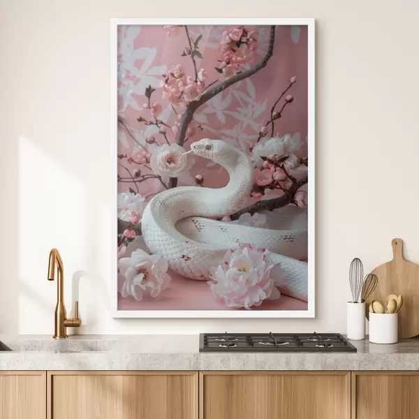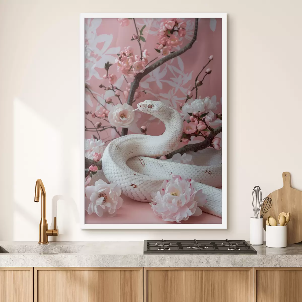 Poster Serpiente blanca y flores rosas. Nr f39941