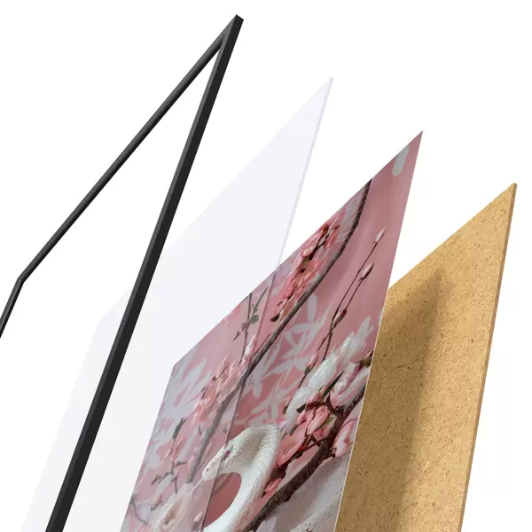 El póster consta de marco, plexiglás, imagen impresa y soporte de aglomerado. El póster puede colgarse inmediatamente en la pared gracias a los soportes de la parte posterior.