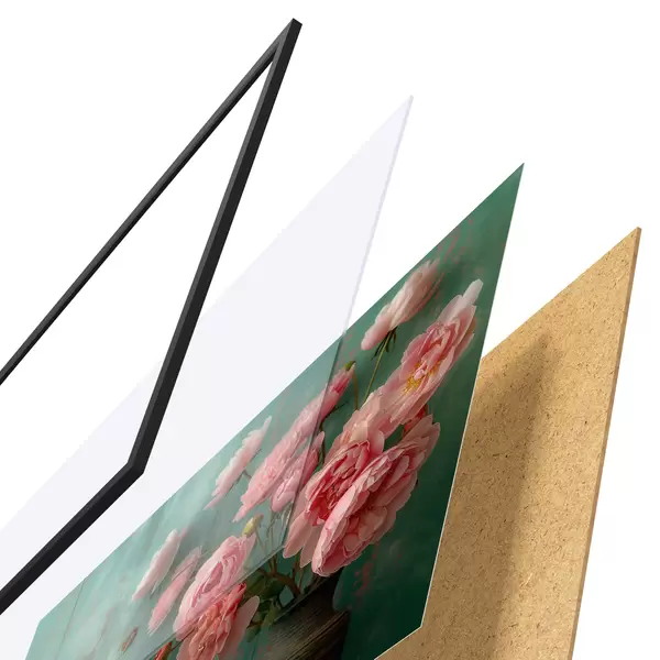 El póster consta de marco, plexiglás, imagen impresa y soporte de aglomerado. El póster puede colgarse inmediatamente en la pared gracias a los soportes de la parte posterior.