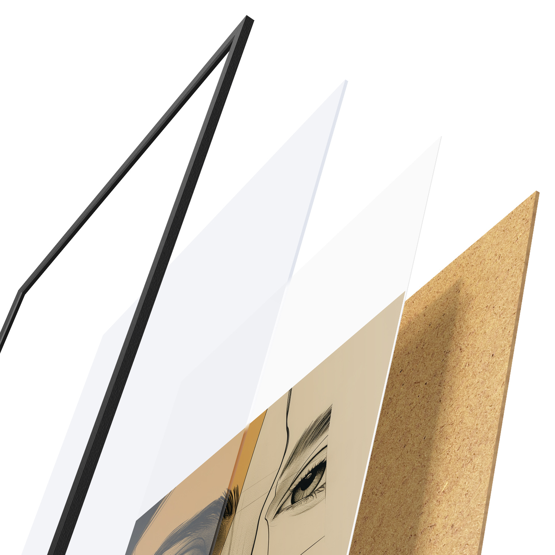 El póster consta de marco, plexiglás, imagen impresa y soporte de aglomerado. El póster puede colgarse inmediatamente en la pared gracias a los soportes de la parte posterior.