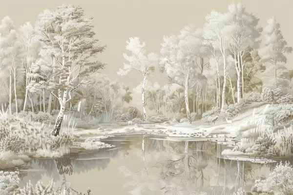 Poster Hermoso paisaje forestal, estanque y árboles, colores beige y blanco. Nr f39979