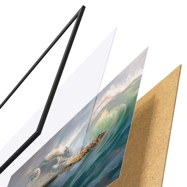 El póster consta de marco, plexiglás, imagen impresa y soporte de aglomerado. El póster puede colgarse inmediatamente en la pared gracias a los soportes de la parte posterior.