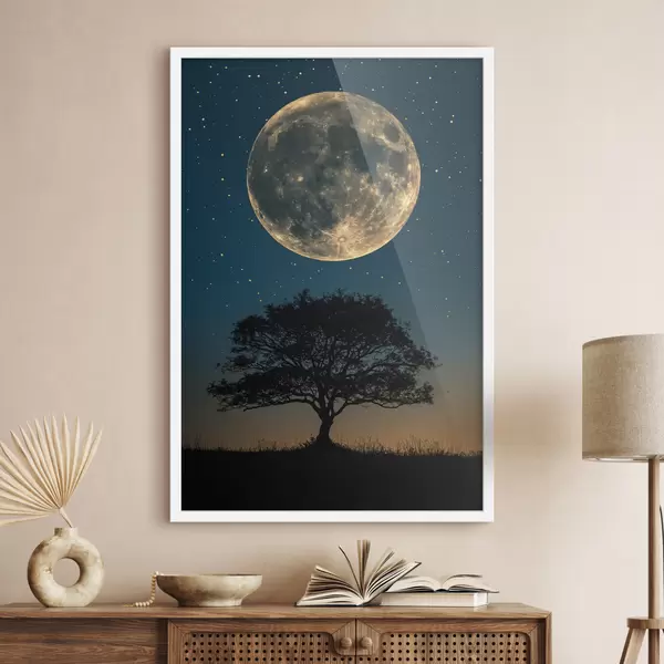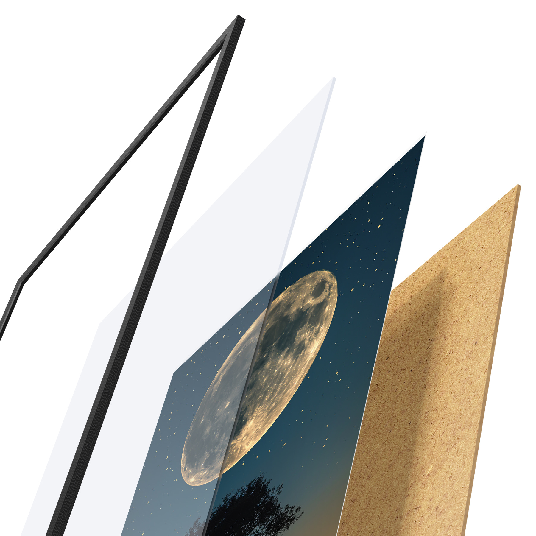 El póster consta de marco, plexiglás, imagen impresa y soporte de aglomerado. El póster puede colgarse inmediatamente en la pared gracias a los soportes de la parte posterior.