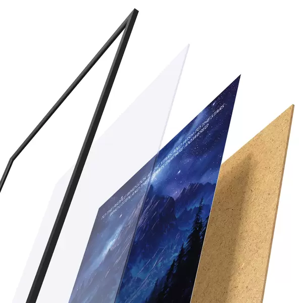 El póster consta de marco, plexiglás, imagen impresa y soporte de aglomerado. El póster puede colgarse inmediatamente en la pared gracias a los soportes de la parte posterior.