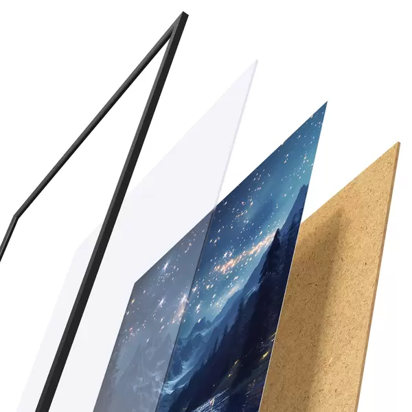 El póster consta de marco, plexiglás, imagen impresa y soporte de aglomerado. El póster puede colgarse inmediatamente en la pared gracias a los soportes de la parte posterior.