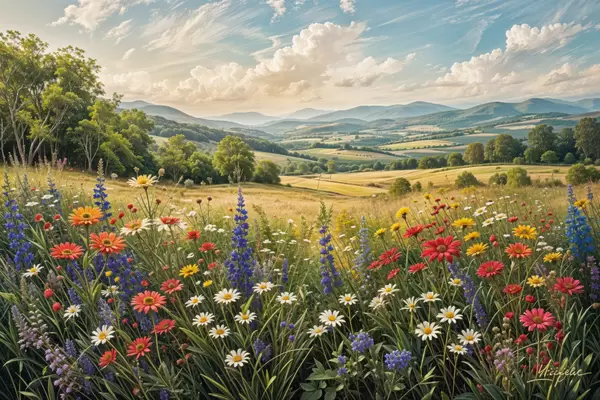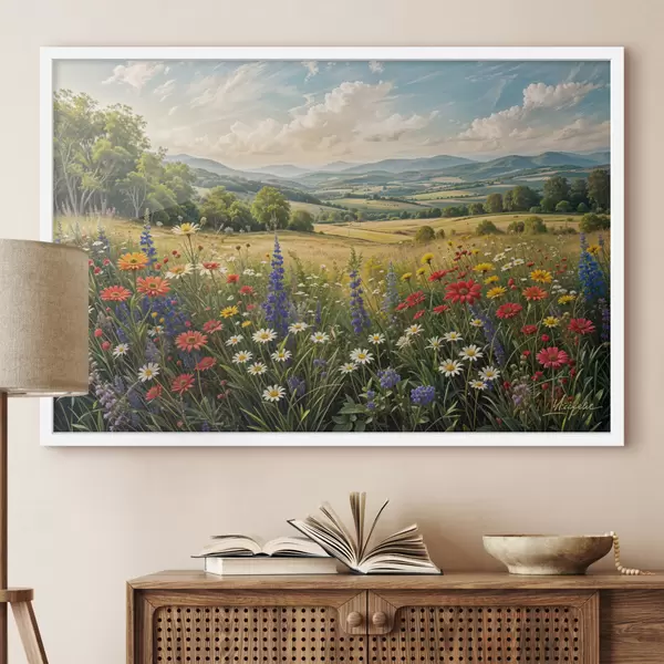 Poster Un exuberante paisaje rural con un prado de flores silvestres vibrantes y lleno de flores coloridas bajo un cielo nublado. f40018