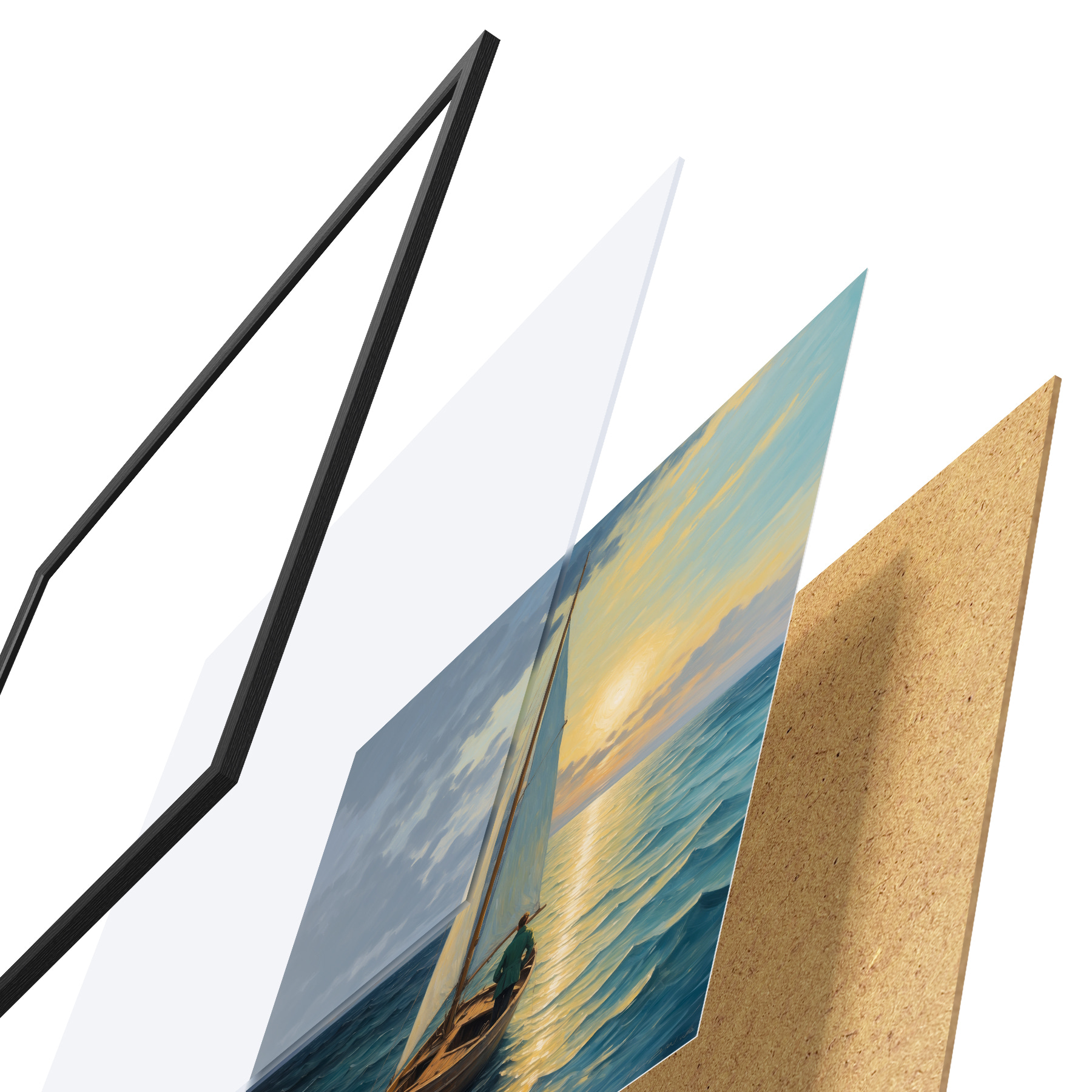 El póster consta de marco, plexiglás, imagen impresa y soporte de aglomerado. El póster puede colgarse inmediatamente en la pared gracias a los soportes de la parte posterior.