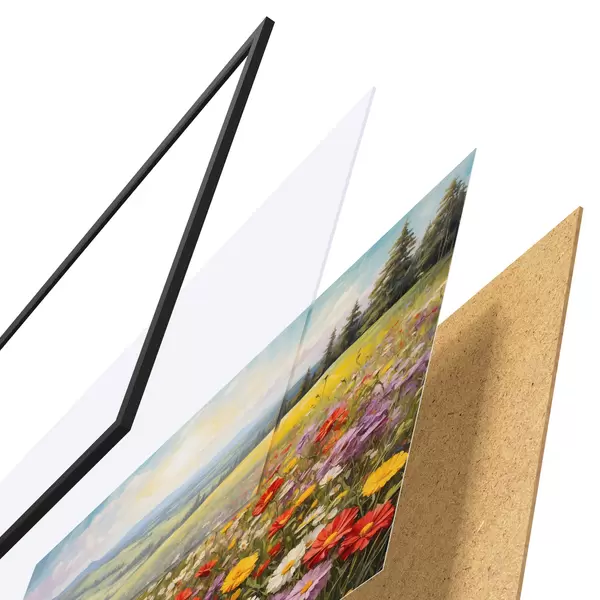 El póster consta de marco, plexiglás, imagen impresa y soporte de aglomerado. El póster puede colgarse inmediatamente en la pared gracias a los soportes de la parte posterior.