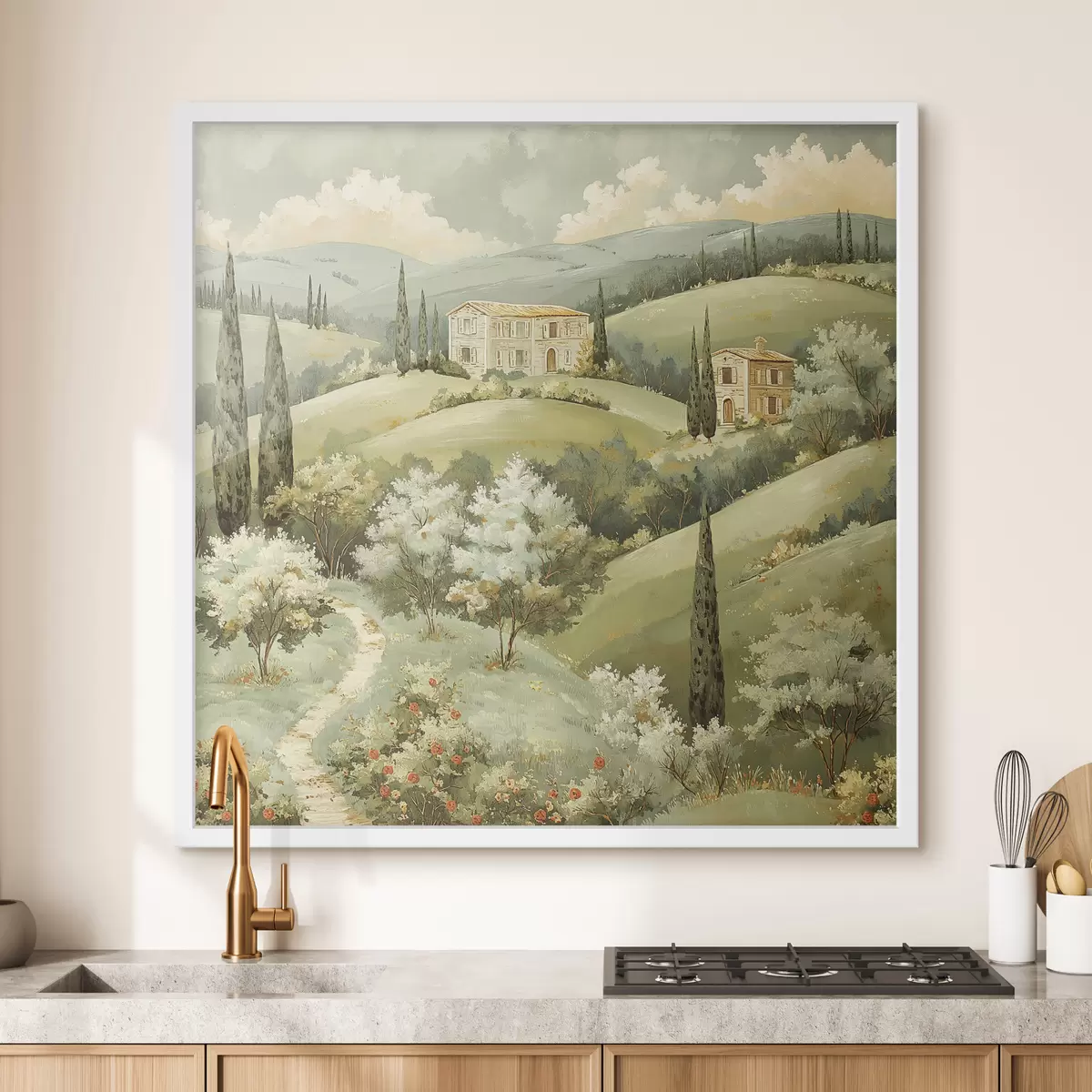Poster Paisaje con casas vintage, colores verde pastel, dibujo acrílico, verano Nr f40078