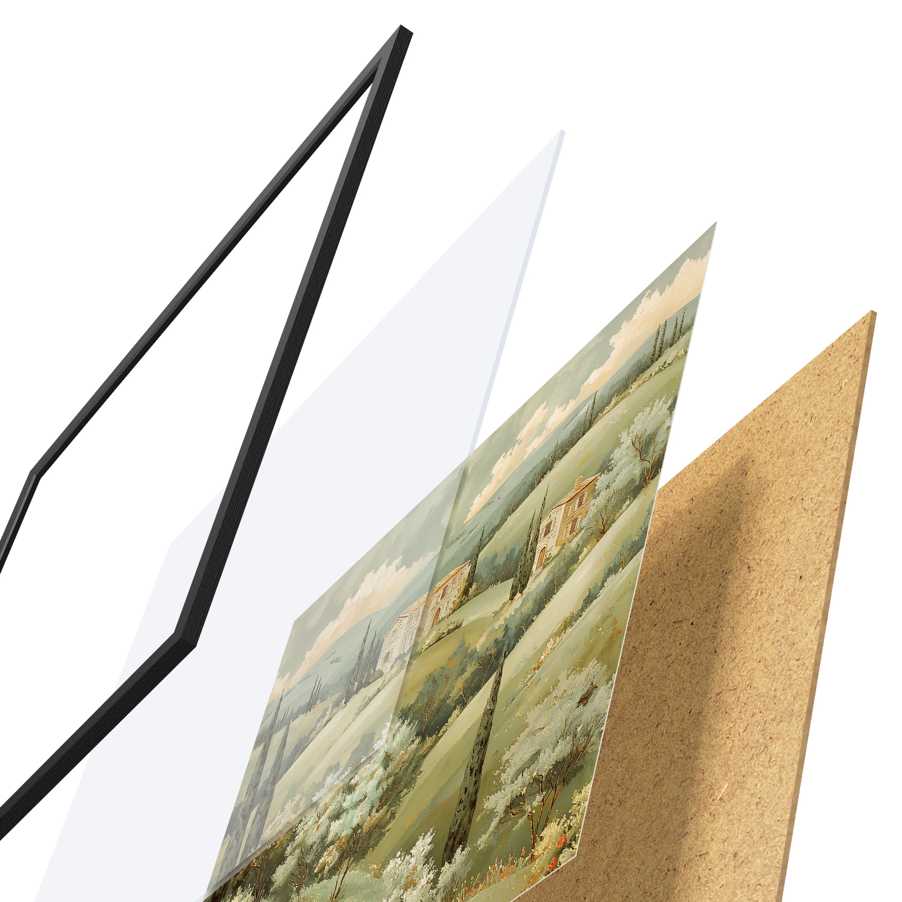 El póster consta de marco, plexiglás, imagen impresa y soporte de aglomerado. El póster puede colgarse inmediatamente en la pared gracias a los soportes de la parte posterior.