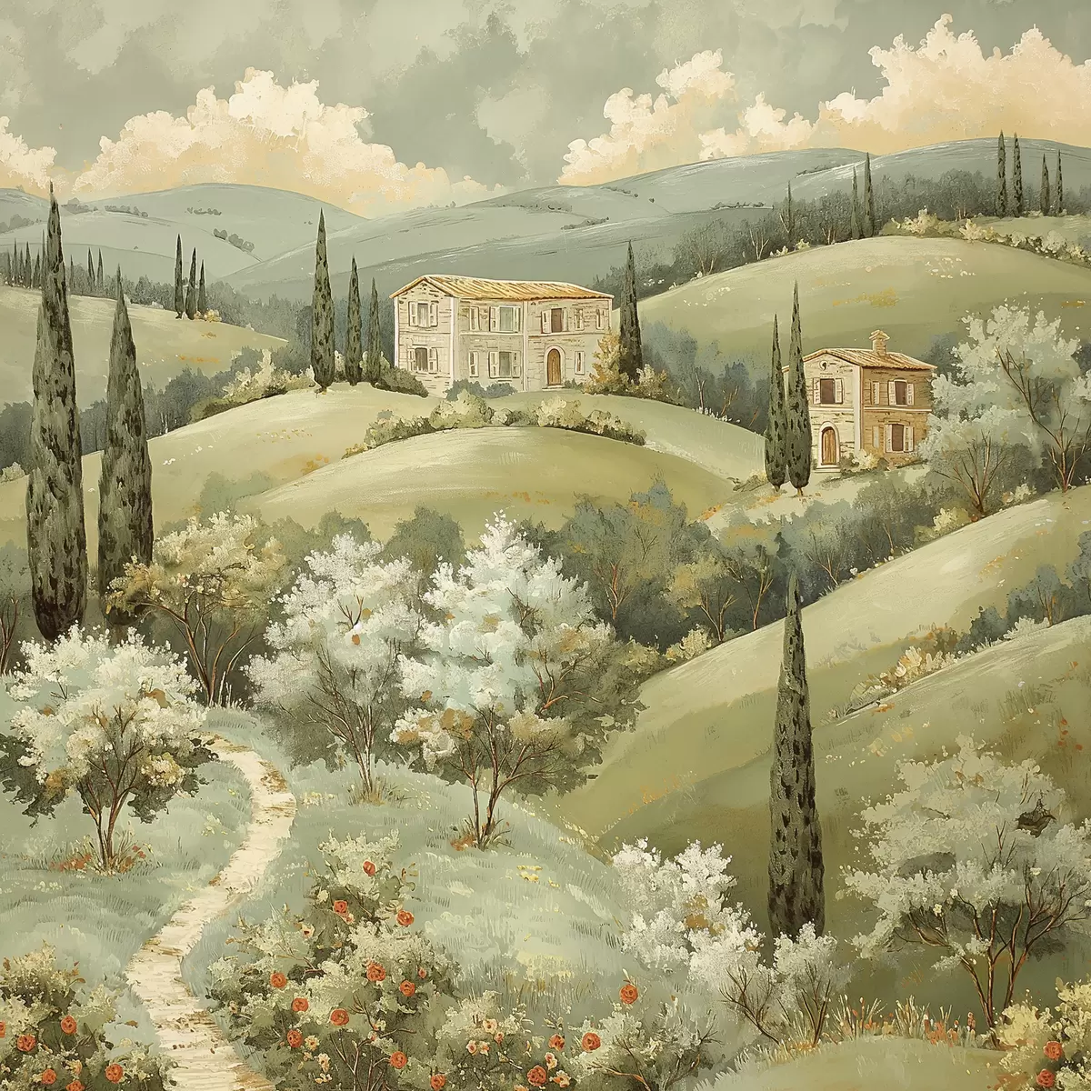 Poster Paisaje con casas vintage, colores verde pastel, dibujo acrílico, verano f40078