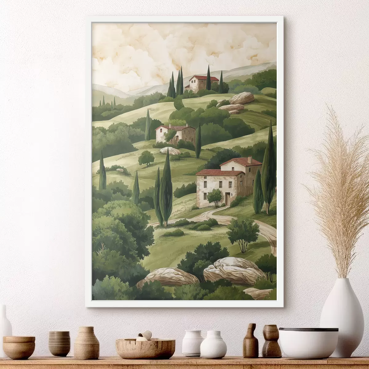Poster Paisaje con casas vintage, colores verde pastel, dibujo acrílico, rústico Nr f40080