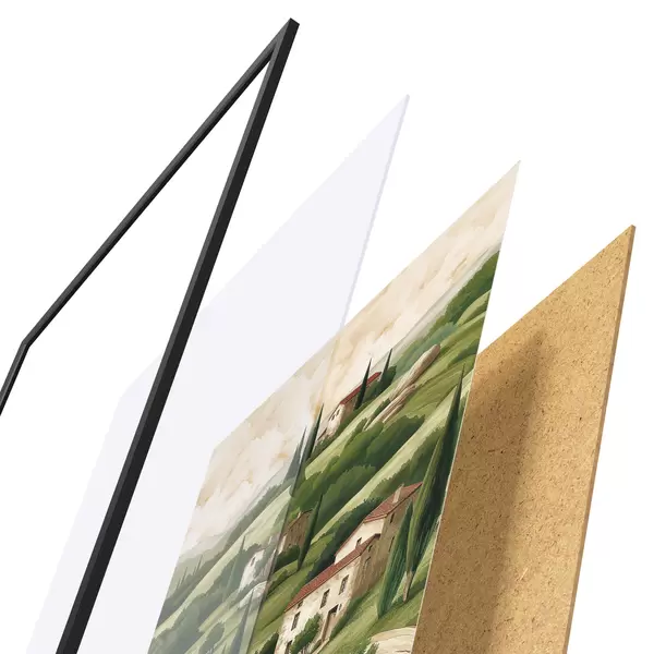 El póster consta de marco, plexiglás, imagen impresa y soporte de aglomerado. El póster puede colgarse inmediatamente en la pared gracias a los soportes de la parte posterior.