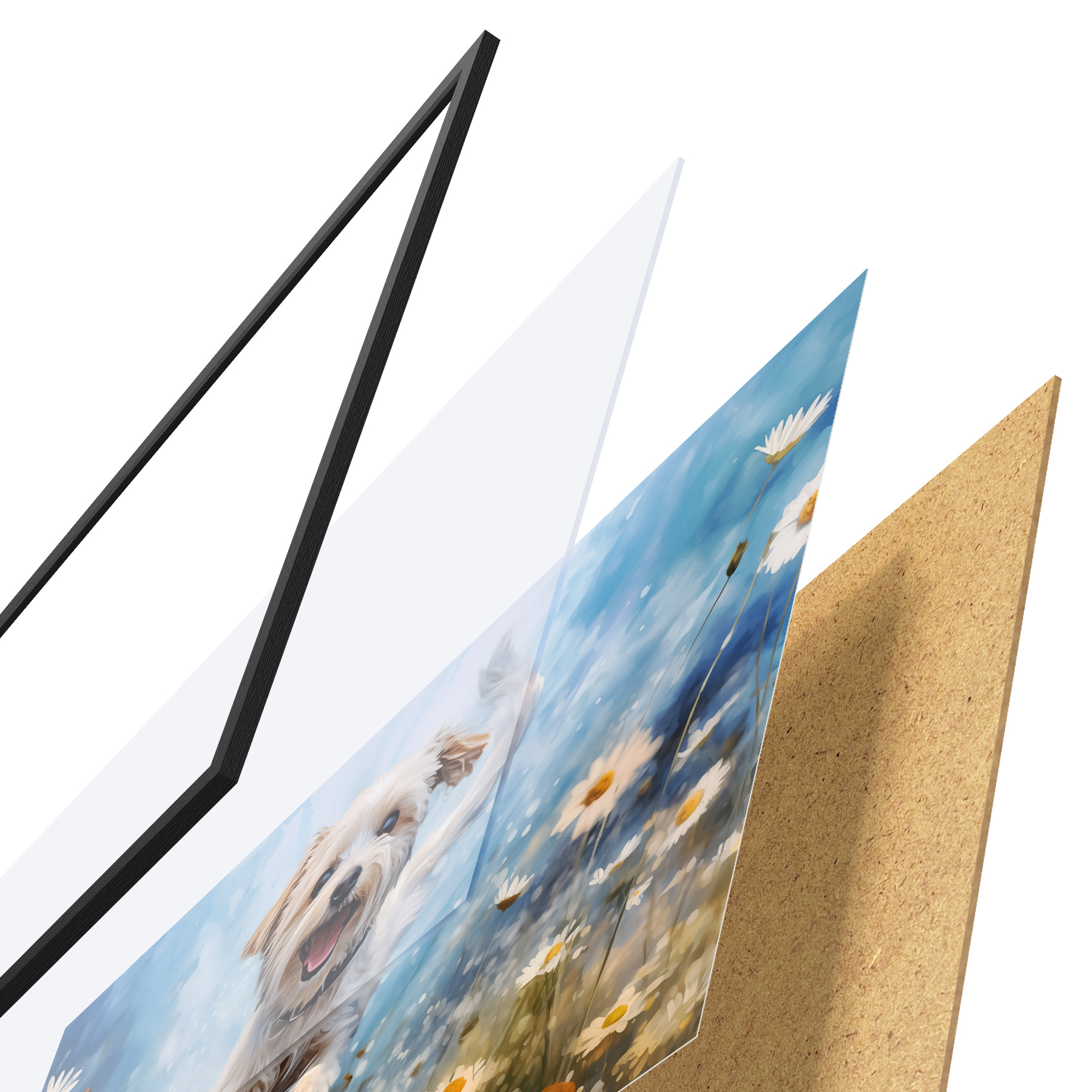 El póster consta de marco, plexiglás, imagen impresa y soporte de aglomerado. El póster puede colgarse inmediatamente en la pared gracias a los soportes de la parte posterior.