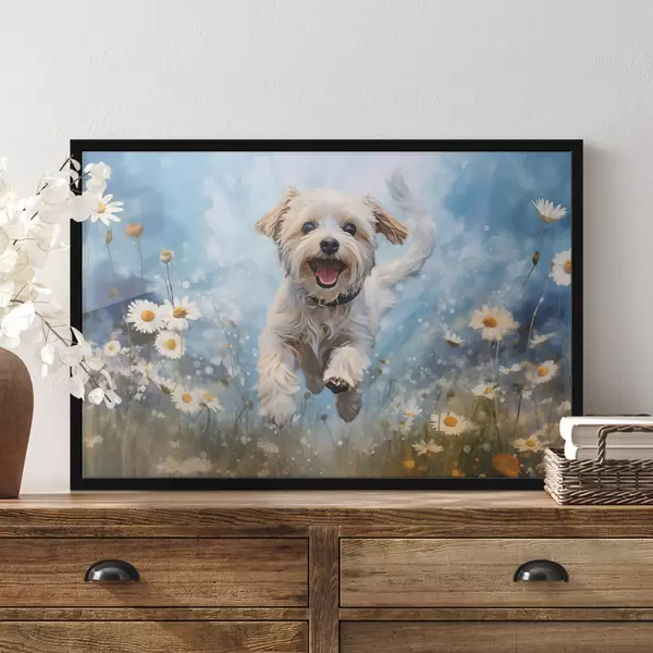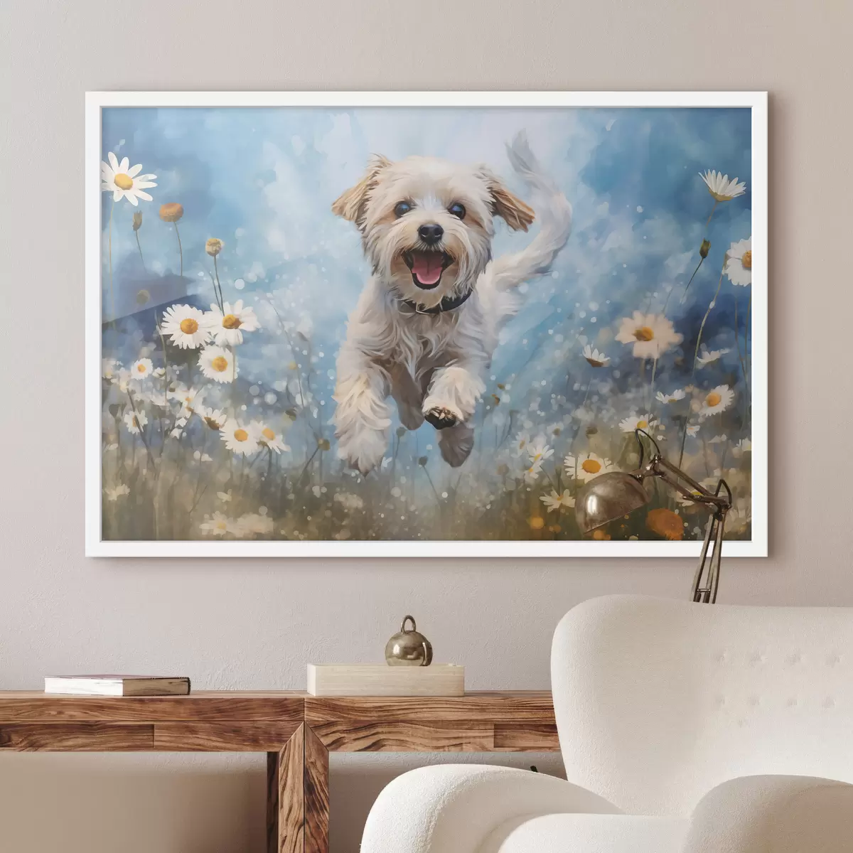 Poster Pequeño perro blanco saltando entre margaritas sobre un fondo azul acuarela Nr f40092