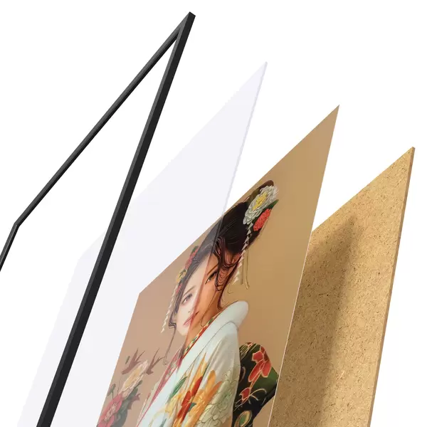 El póster consta de marco, plexiglás, imagen impresa y soporte de aglomerado. El póster puede colgarse inmediatamente en la pared gracias a los soportes de la parte posterior.