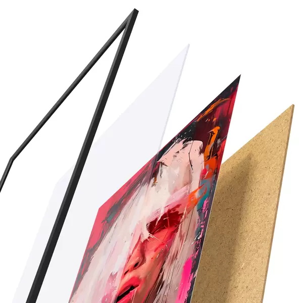 El póster consta de marco, plexiglás, imagen impresa y soporte de aglomerado. El póster puede colgarse inmediatamente en la pared gracias a los soportes de la parte posterior.