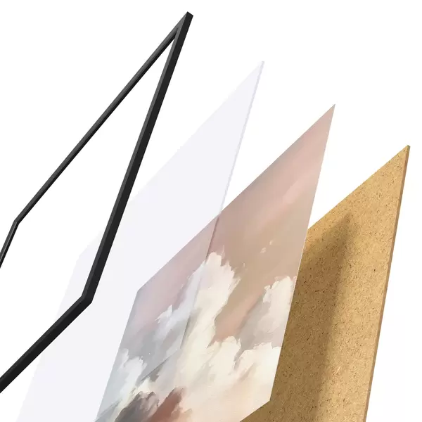 El póster consta de marco, plexiglás, imagen impresa y soporte de aglomerado. El póster puede colgarse inmediatamente en la pared gracias a los soportes de la parte posterior.
