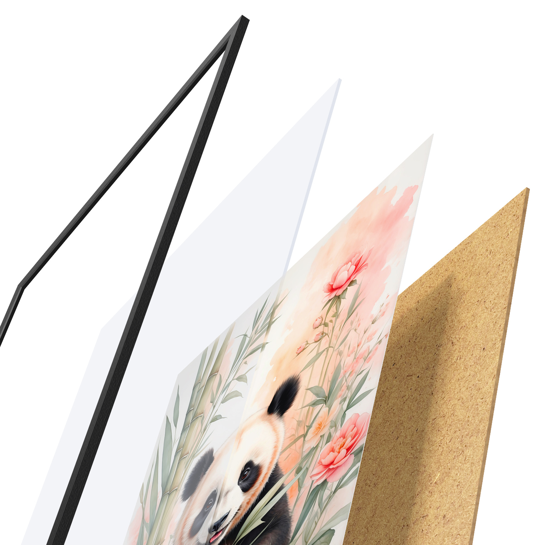 El póster consta de marco, plexiglás, imagen impresa y soporte de aglomerado. El póster puede colgarse inmediatamente en la pared gracias a los soportes de la parte posterior.
