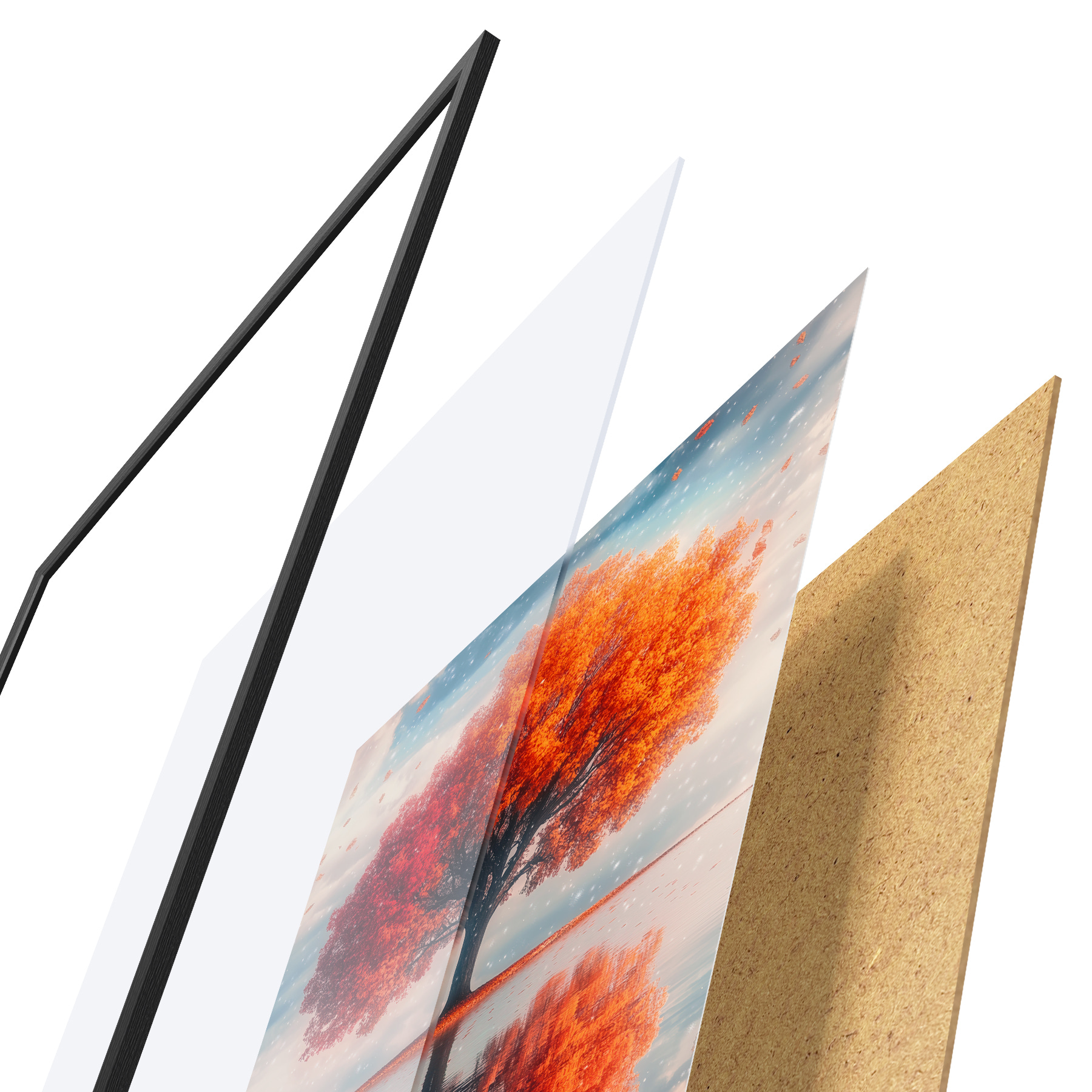 El póster consta de marco, plexiglás, imagen impresa y soporte de aglomerado. El póster puede colgarse inmediatamente en la pared gracias a los soportes de la parte posterior.