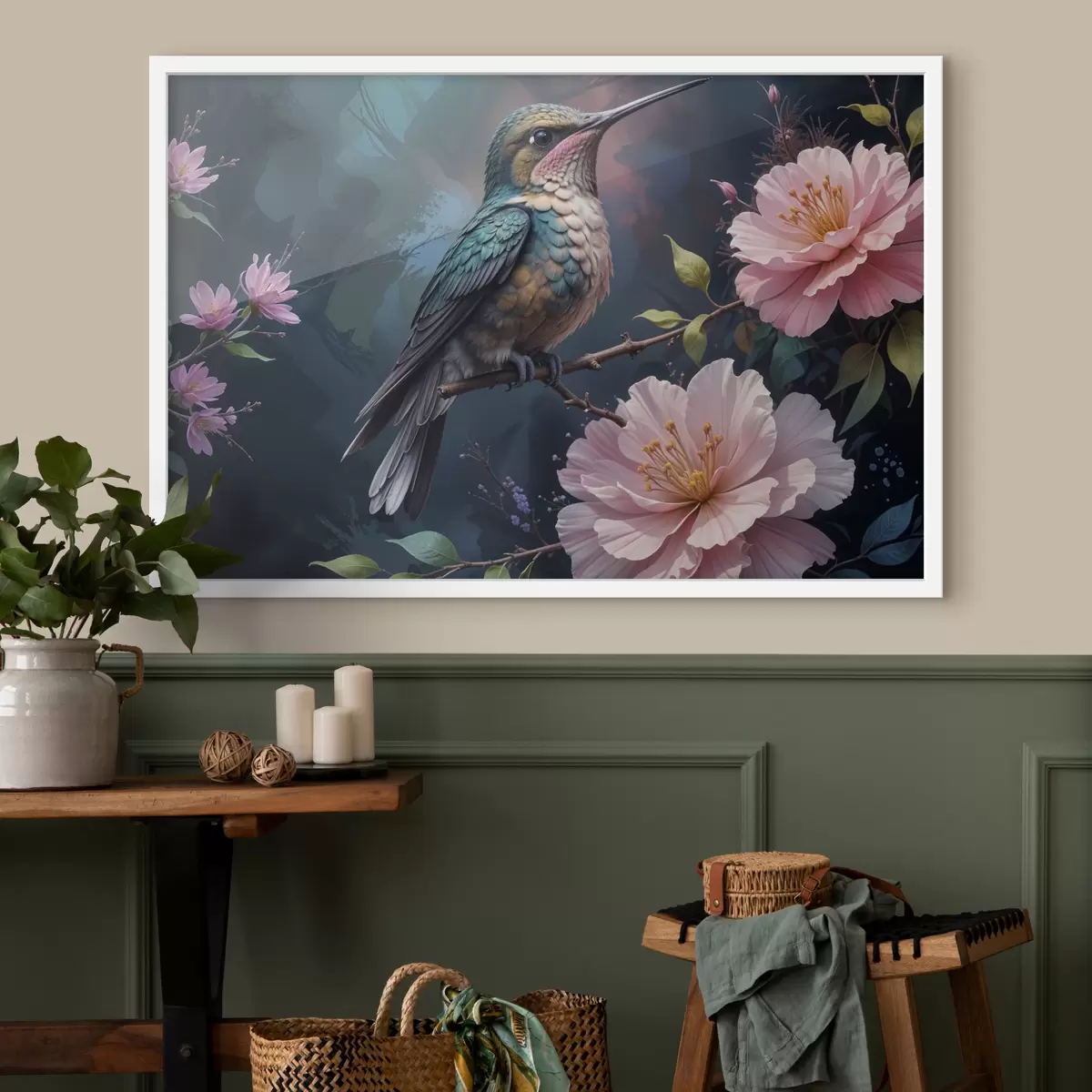 Poster Un colibrí colorido posado en una rama con flores rosas vibrantes en el fondo. Nr f40155