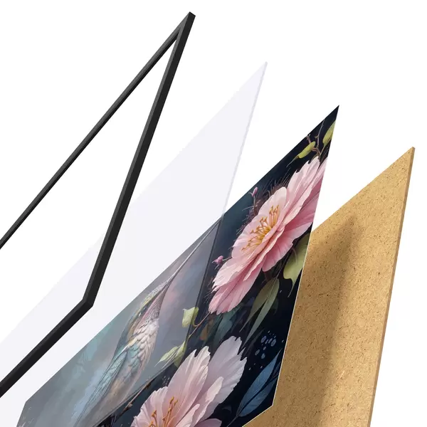 El póster consta de marco, plexiglás, imagen impresa y soporte de aglomerado. El póster puede colgarse inmediatamente en la pared gracias a los soportes de la parte posterior.