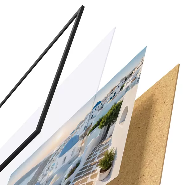 El póster consta de marco, plexiglás, imagen impresa y soporte de aglomerado. El póster puede colgarse inmediatamente en la pared gracias a los soportes de la parte posterior.