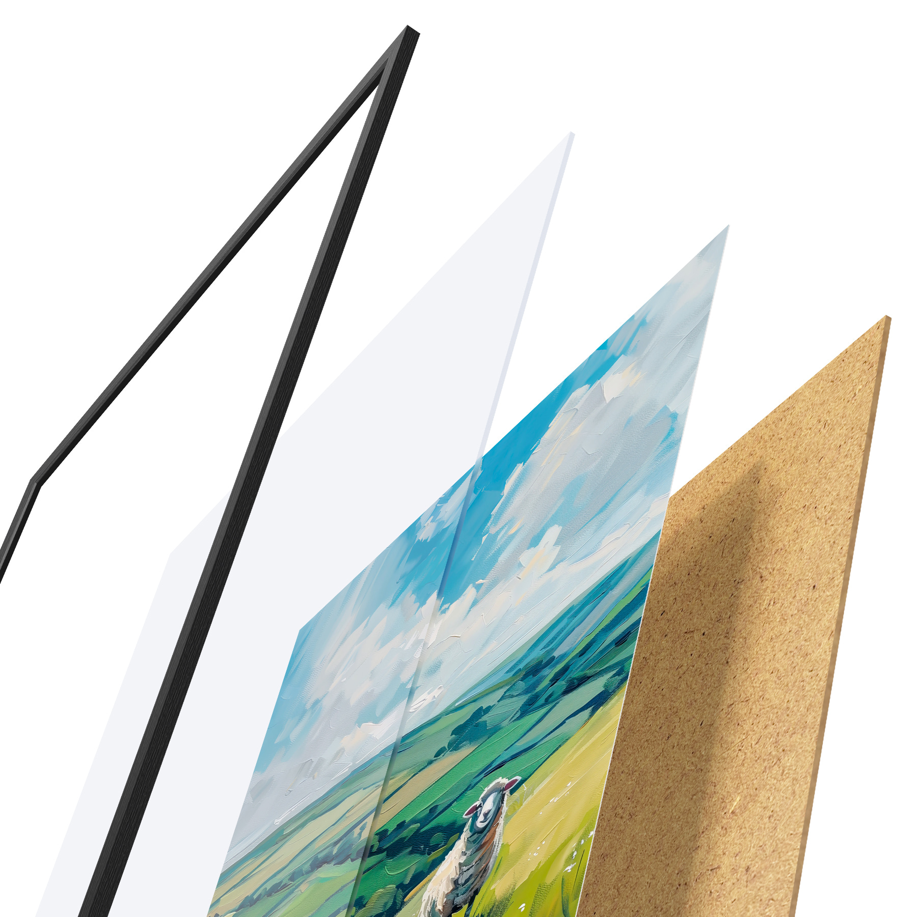 El póster consta de marco, plexiglás, imagen impresa y soporte de aglomerado. El póster puede colgarse inmediatamente en la pared gracias a los soportes de la parte posterior.