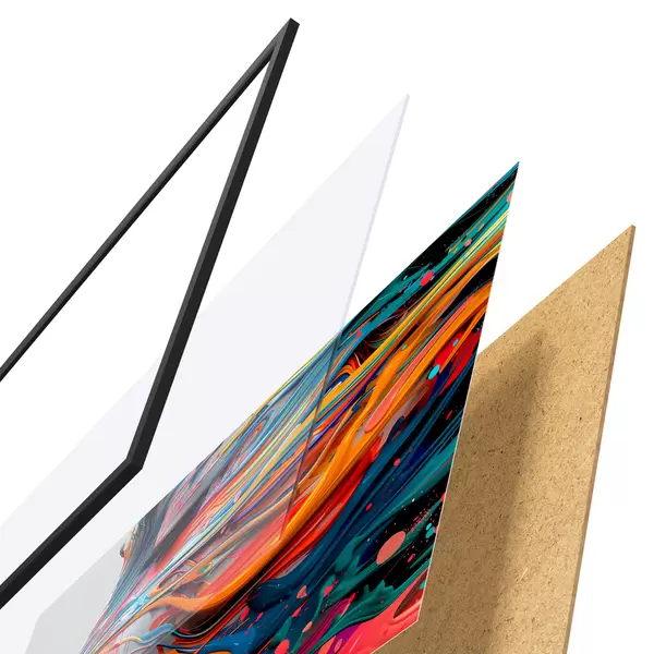 El póster consta de marco, plexiglás, imagen impresa y soporte de aglomerado. El póster puede colgarse inmediatamente en la pared gracias a los soportes de la parte posterior.