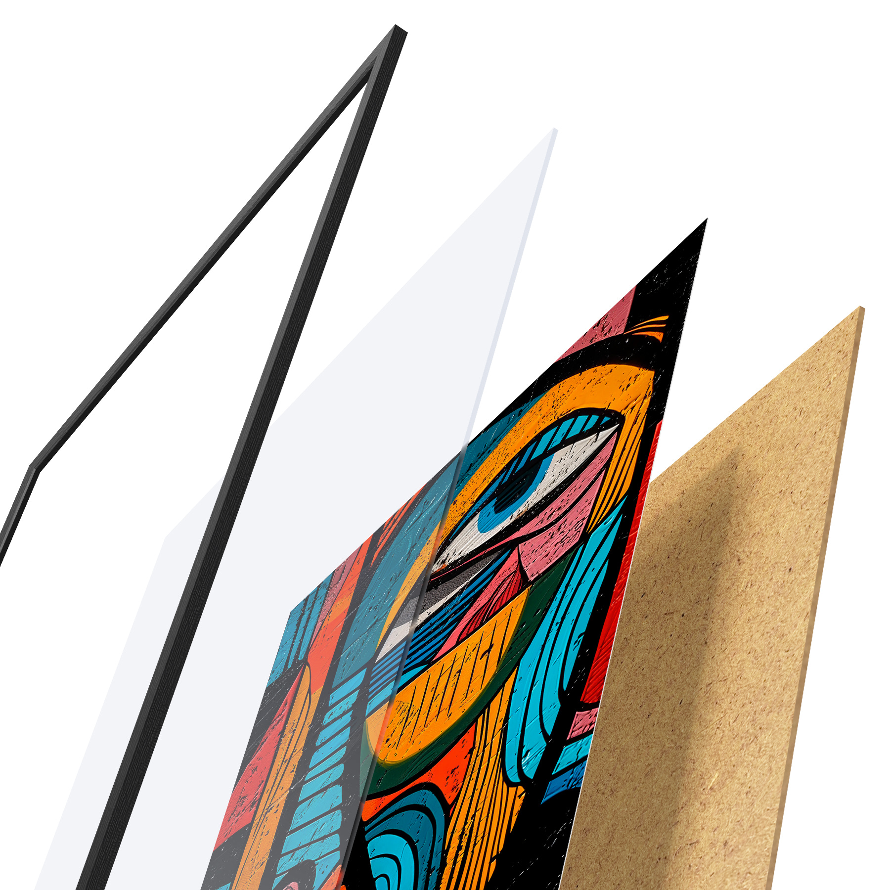 El póster consta de marco, plexiglás, imagen impresa y soporte de aglomerado. El póster puede colgarse inmediatamente en la pared gracias a los soportes de la parte posterior.