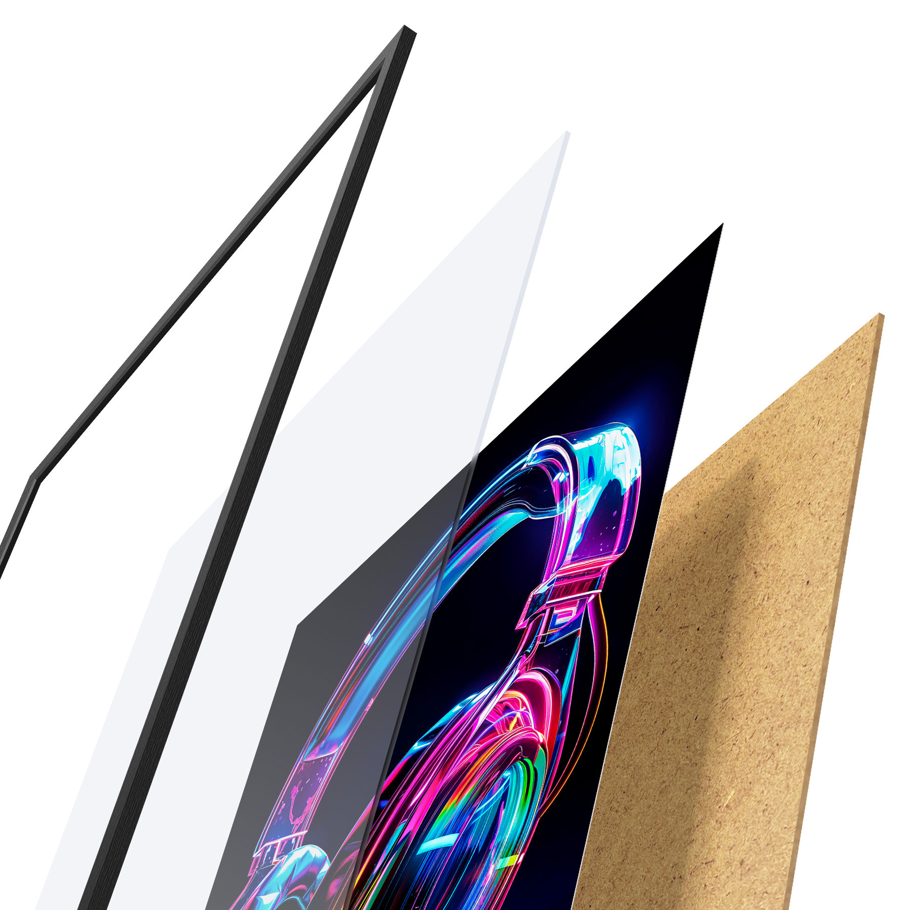 El póster consta de marco, plexiglás, imagen impresa y soporte de aglomerado. El póster puede colgarse inmediatamente en la pared gracias a los soportes de la parte posterior.