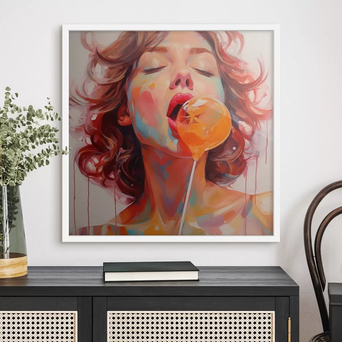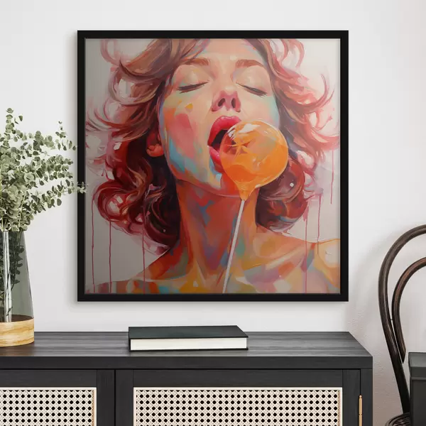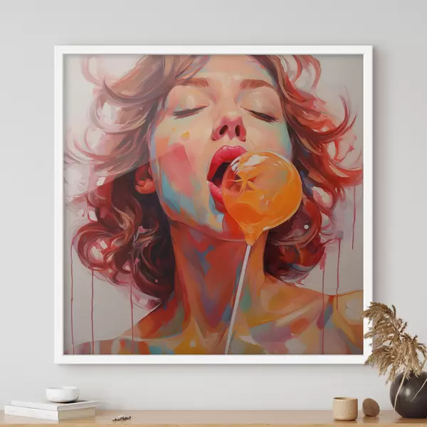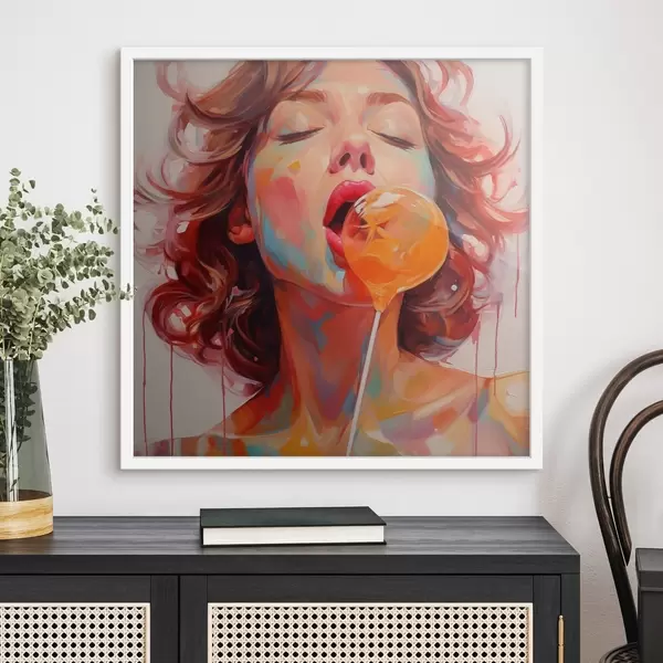 Poster Una niña con el pelo rizado en tonos claros lame una piruleta f40213