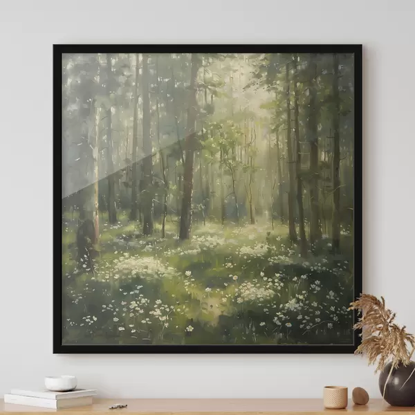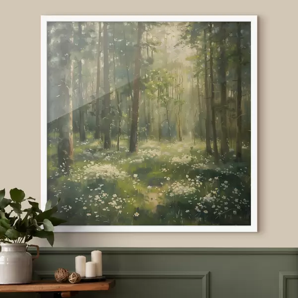 Poster Bosque con luz solar en los árboles, flores de manzanilla, hierba verde, dibujo acrílico. Nr f40226